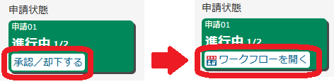 申請元アプリの「進行中」ボタンを押下するとDmSワークフローへ遷移し、「差し戻す」「取り下げる」など「承認」「却下」以外のアクションも実行可能となっております。そのため、ユーザー様の操作内容をより正確に反映する目的で、文言を変更いたします。 (自動アップデート)2025年11月21日 22:00 以降 |