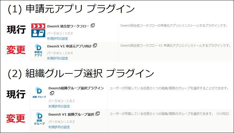 | 機能説明 | 【機能改善】申請元プラグインおよびDeemS組織グループ選択プラグイン(兼務対応)のアイコンデザイン等の変更 アイコンのデザインを統一しました。(※アプリではなくプラグインのアイコンデザイン) 今後リリースされるものは新デザインにてリリースとなりますので、デザインを統一されたい場合は、この機にアップデートを行っていただくことをお勧め致します。